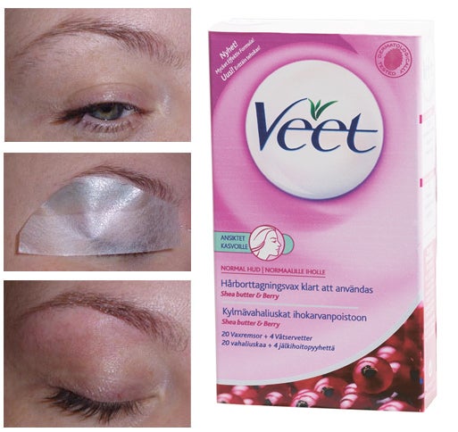 Veet har superbra miniremsor med vax anpassade för ansiktet. Jag klipper till dem i en lämplig form, placerar dem under brynet och drar loss. Självklart känns det, men det går över på sekunden och man vänjer sig snabbt.