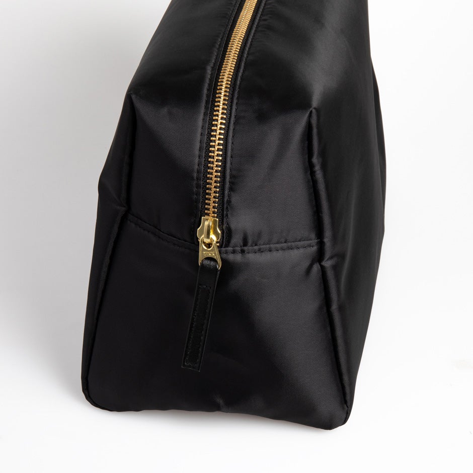 En medelstor necessär som rymmer det viktigaste. Den har ett stort fack där det även finns behållare för penslar och ett litet fack med dragkedja. Sminkväskan är gjord i veganskt läder.